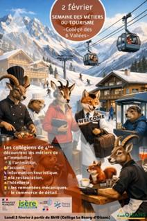 Le lundi 02 février, dans le cadre de la Semaine du tourisme, le collège Des 6 Vallées a organisé en partenariat avec la DDETS38, France Travail, la communauté de commune de l’Oisans, et avec la présence d’entreprises du territoire, une journée de découverte des métiers du tourisme pour les élèves de 4ème.