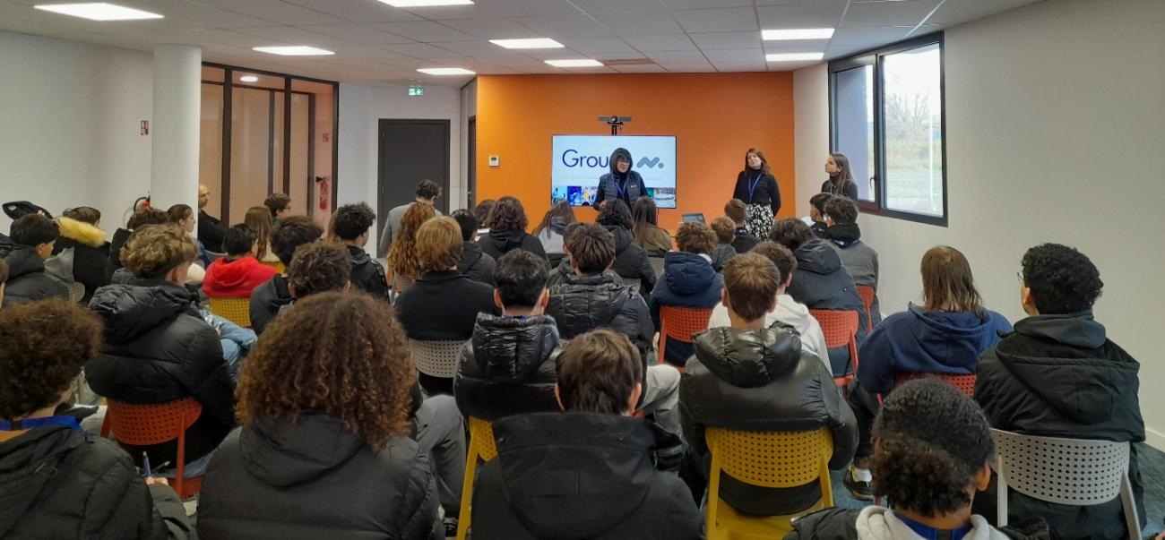 Les élèves ont ensuite assisté à une présentation du Groupe M, enrichie par la diffusion de vidéos mettant en lumière le parcours de collaboratrices de l’entreprise. Ces témoignages filmés ont permis d’illustrer concrètement la diversité des métiers et des parcours possibles dans l’industrie.